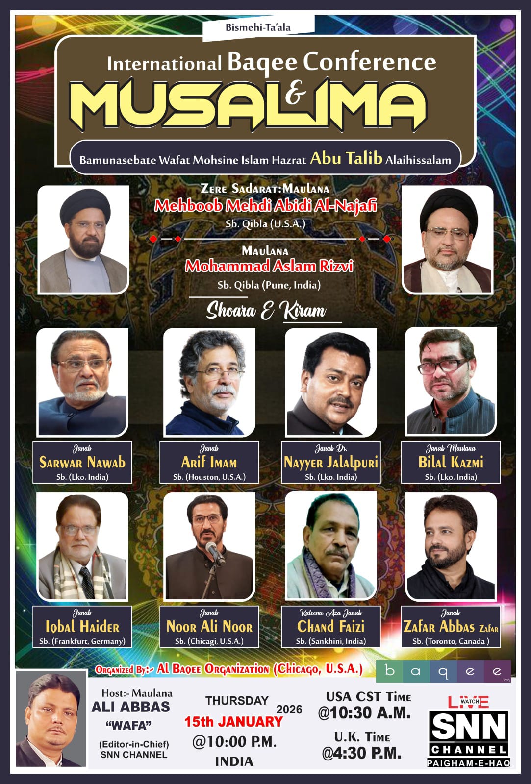 ممبئی: زوم کے ذریعے البقیع آرگنائزیشن شکاگو امریکہ کی جانب سے حضرت ابوطالب علیہ السلام کی وفات کی مناسبت سے اردو زبان کے مشہور و معروف شعرائے کرام کے ساتھ ایک عظیم الشان انٹرنیشنل کانفرنس و مسالمہ مفسر قرآن علامہ سید محبوب مہدی عابدی نجفی کی صدارت میں برگزار ہوا ۔